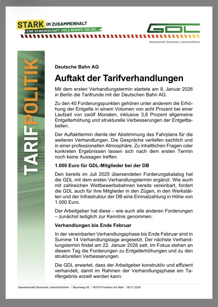 Mit dem ersten Verhandlungstermin startete am 8. Januar 2026 in Berlin die Tarifrunde mit der Deutschen Bahn AG.